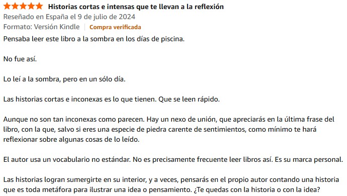 Como siempre digo, una buena reseña no es solo bueno para la popularidad del libro sino que es la verdadera ilusión a la hora de publicar. Pensar que algo de lo que has hecho ha gustado a otra persona o que le ha servido de utilidad o para hacerle sentir algo, es la mejor manera de animarme a continuar.