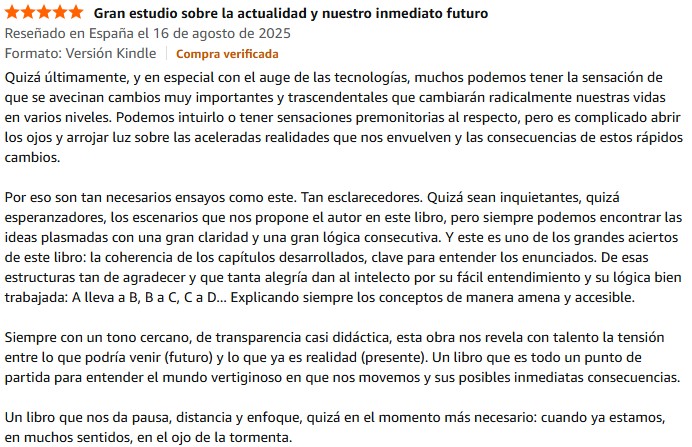Únete a la exploración de nuestro futuro cercano y cómo afecta a la esencia de la humanidad. Un ensayo donde trato de discernir cuál puede ser esa identidad en un futuro que parece que se nos acerca con rapidez, apoyándome en una serie de argumentaciones que sirven para defender una idea: que a lo largo de los años, de las décadas y de muchísimo tiempo, se nos ha estado avisando de ese futuro perturbador.